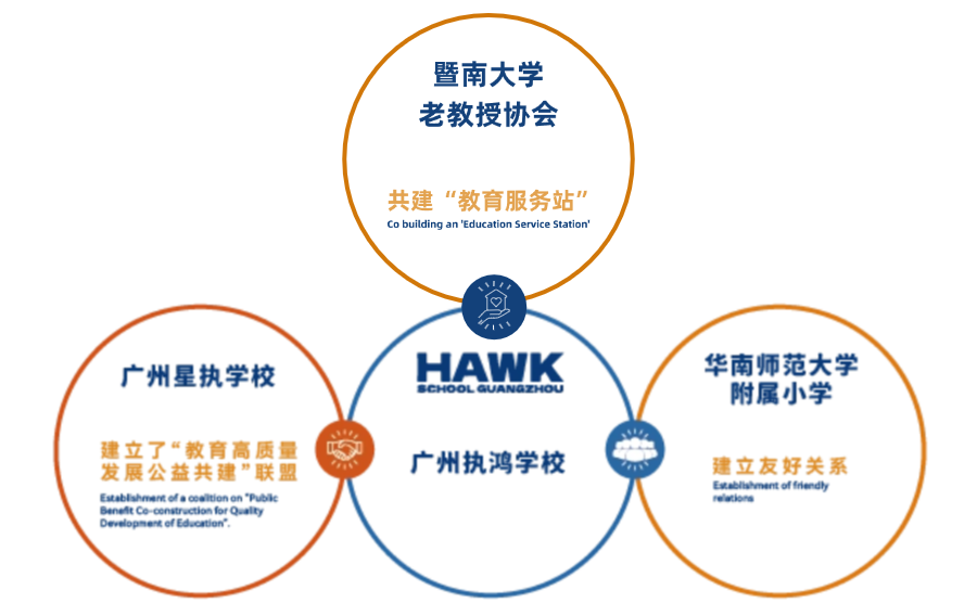 学校与暨南大学老教授协会共同成立了“教育服务站”,通过资源整合与创新实践,共同打造基础教育高质量发展新范式;与广州市星执学校建立了"教育高质量发展公益共建"联盟,与华南师范大学附属小学是友好学校。