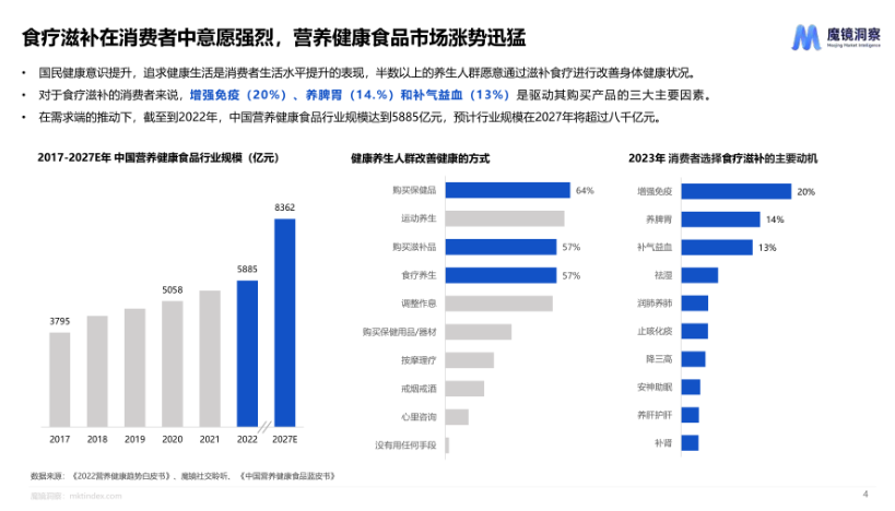 - 药食同源市场概览:食疗滋补在消费者中意愿强烈,营养健康食品市场涨势迅猛,人群画像:中老年人渗透率高,男性养生意识增强,年轻人传统养生需求提升,淘系平台药食同源市场的销售额呈小幅下降,而销量持续增长,表明消费者仍有一定需求。