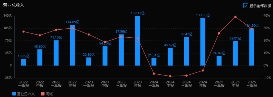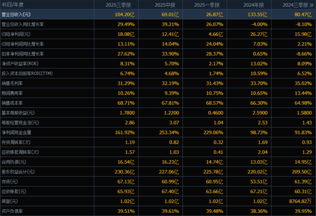 2025年三季度的营业总收入为104.20亿元,相较于2024年三季度的80.47亿元,增长了29.49%。