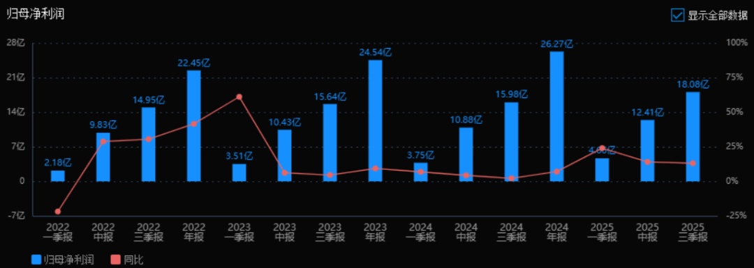 2025年三季度的归母净利润为18.08亿元,相较于2024年三季度的15.98亿元,增长了13.11%。