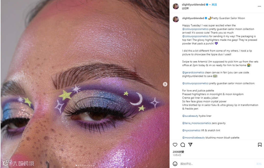 从运营数据来看,ColourPop 在 Instagram 上的粉丝量已达突破千万,该品牌账号自2013年创建以来,累积发布帖子高达1.6万余篇。账号内容主要包括新品预热、网红KOL合作、美妆教程和产品测评等。近期 ColourPop 的热门帖子表现亦不俗,如新推出的“Cloud 9眼影盘”和与动漫IP《美少女战士》合作的系列,相关宣传帖均获得过万点赞。此外,ColourPop还会积极构建大量品牌话题,引导用户参与讨论并扩散品牌影响力。例如话题“#colourpopme”的相关发帖量就高达近130万,ColourPop也会定期给重要KOL寄送试用品,以引导其参与话题的内容建设。
