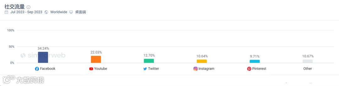 据 SimilarWeb 数据显示,ColourPop 独立站官网在社媒上的流量贡献占全渠道为15.69%,其中流量主要来源 Facebook、Youtube、Twitter、Instagram 和 Pinterest。