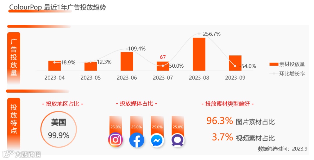 在投放素材类型偏好上,ColourPop 广告以图片形式为主,占比达99.9%。这也说明图片广告对于ColourPop 的彩妆产品宣传更为直观有效。总体来说,ColourPop 的媒体广告投放具有较强的针对性,会根据品牌推广计划需要动态调整。