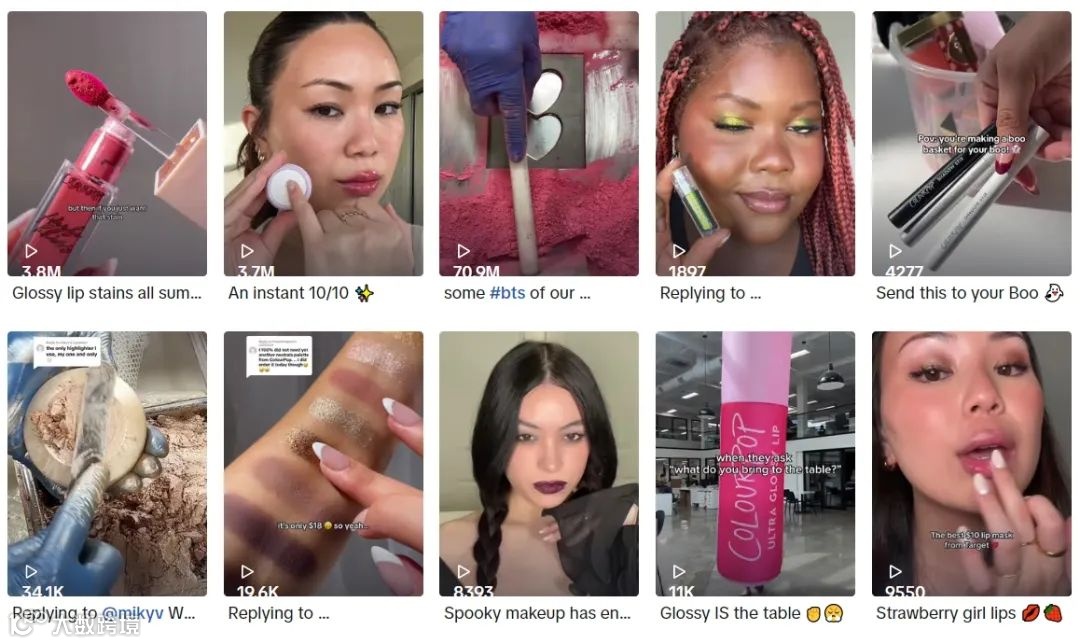 除了 Instagram,ColourPop 在 Facebook 和 TikTok 也拥有众多粉丝,分别达到了240万和130万。从互动数据来看,ColourPop 在 TikTok 上表现更出色,最近30天共发布了78条视频,新增粉丝高达4.9万人,点赞数增长达77.9万。在内容制作方面,主要制作大量真人试用视频,以展示产品的效果。种多平台互动和内容制作的策略,使得 ColourPop 能够在不同社交媒体上与粉丝建立更紧密的联系,进一步提升了品牌的知名度和影响力。