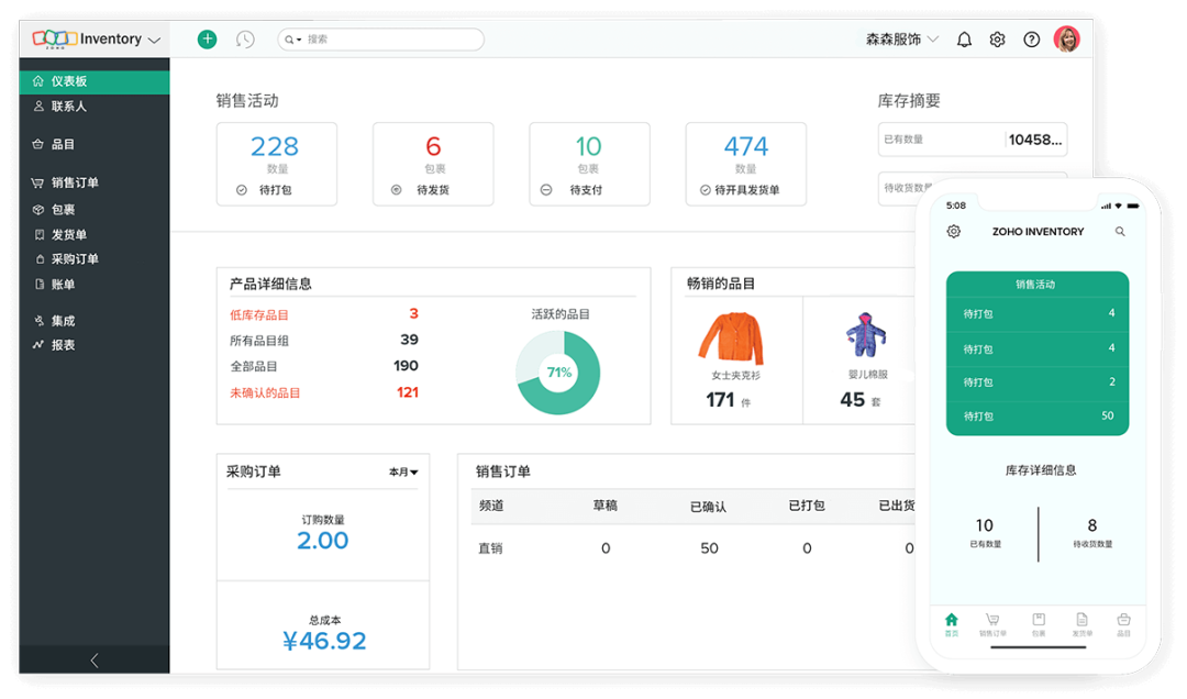 3、库存管理与跟踪:实时跟踪库存水平,当库存数量低于设定阈值时,系统会自动发出警报。通过分析库存数据,企业可以优化库存周转率,避免缺货或积压库存情况的发生。同时,Zoho Inventory提供详细的库存报表,帮助企业了解库存的销售趋势和周转情况,从而做出更合理的采购和补货计划。