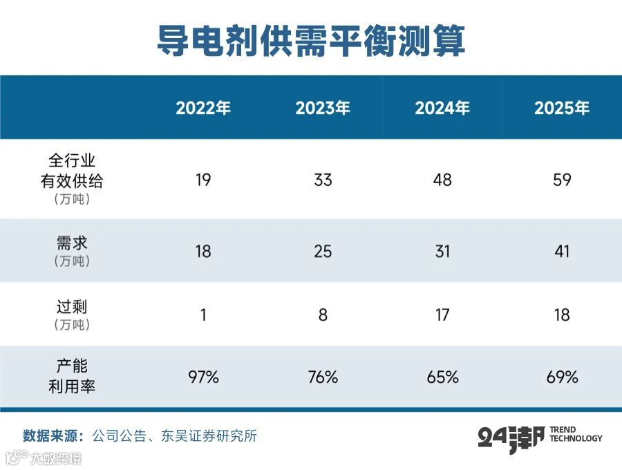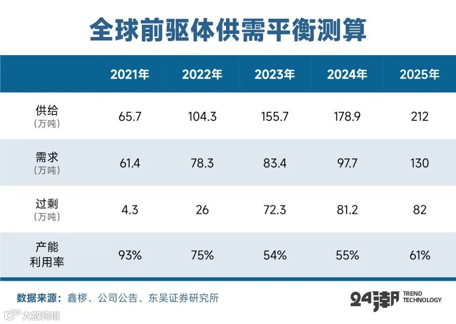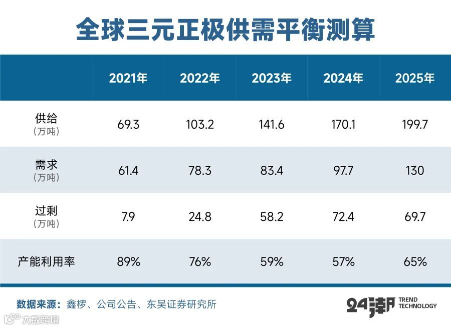 不过,随着新产能的加速释放,三元前驱体正在成为锂电产业产能过剩最严重的赛道之一。比如根据东吴证券预测,24年三元前驱体领域预计新增供给20万吨+,新增需求约14万吨,产能利用率仍维持低位55%。