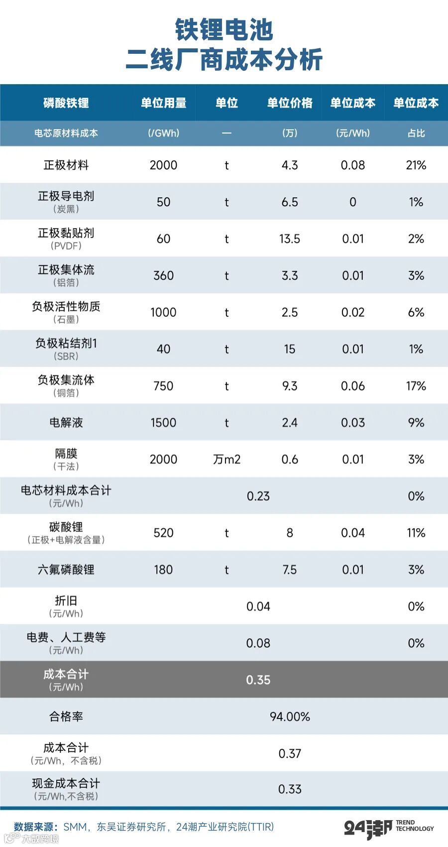 考虑到行业三线电池厂目前产能利用率预计仅有30-40%,且良品率较低,B品较多,预计铁锂电芯成本超0.4元/Wh,三元电芯成本可能超过0.6元/Wh。
