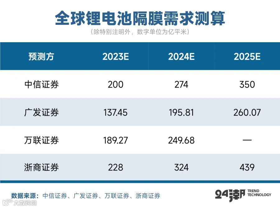 在新能源产业崛起的大势下,锂电隔膜需求量未来几年大概率仍将保持增长趋势,综合中信证券、浙商证券、广发证券等券商分析2025年全球锂电池隔膜需求约为260-439亿平米。