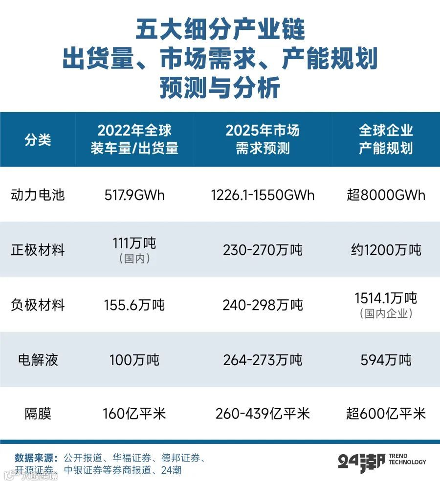 首先看24潮产业研究院(TTIR)统计的一组数据:截止目前,在动力电池、储能电池、正极材料、负极材料、电解液与锂电隔膜这6大核心赛道上,已知的企业产能规划均远超2025年第三方研究机构对市场需求的预测上限,未来三年内出现严重产能过剩似乎已经不可避免。