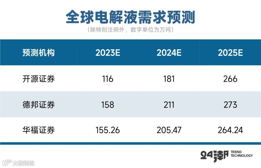 从产业趋势看,未来电解液市场需求也将大概率保持增长趋势,综合券商分析预测,2025年全球电解液需求约为264-273万吨。