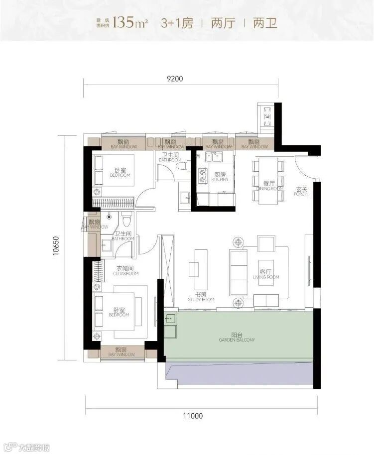 建面约135平,3+1房两厅两卫