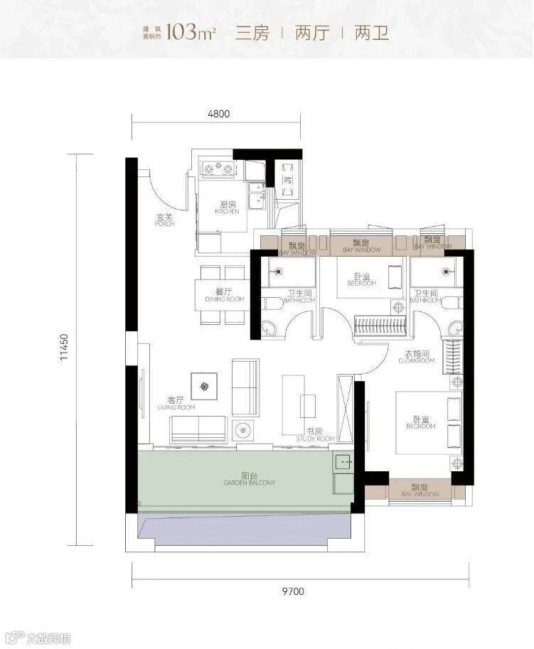 该户型做到了三面空间可拓展,南向大阳台+大花池,提升了客餐厅的使用空间;5个飘窗可全优化,优化后房间整体更方正,空间感更强。