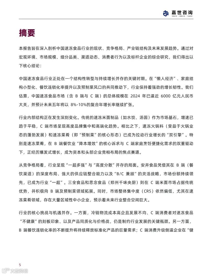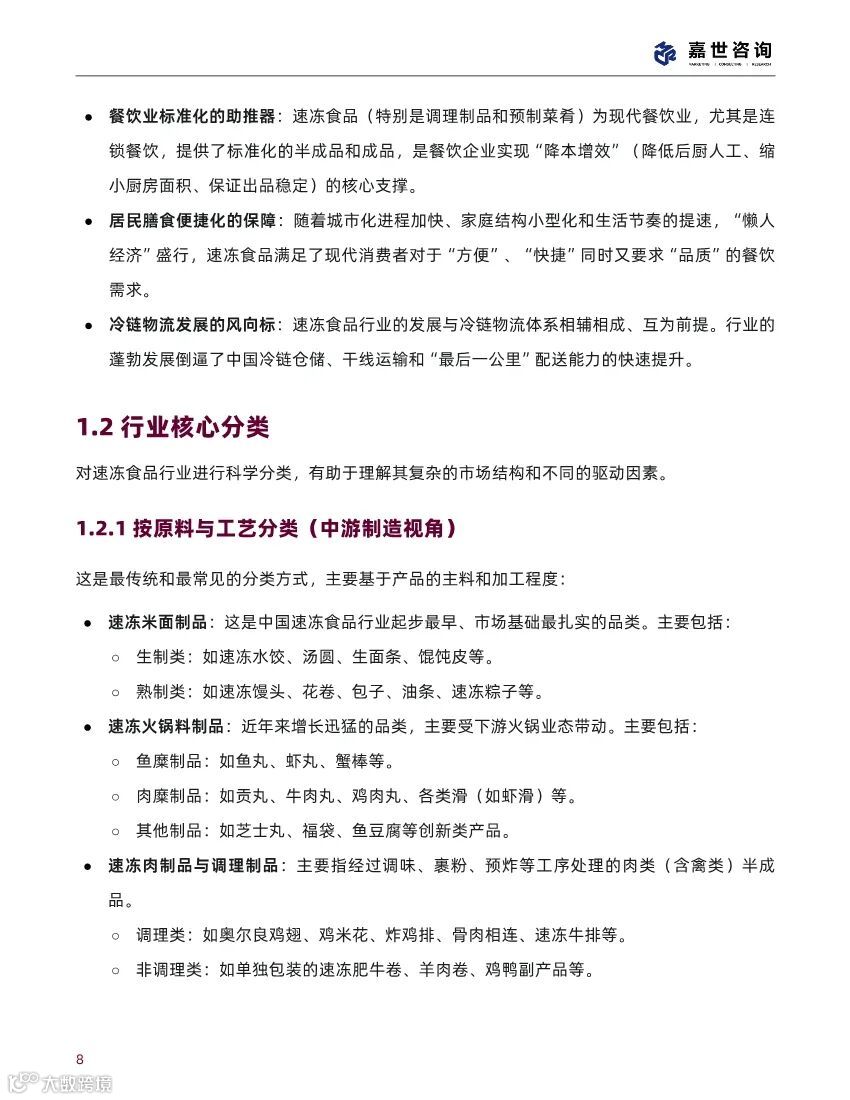《2025中国速冻食品行业现状与发展趋势报告》由嘉世咨询出品,深入剖析了中国速冻食品行业的现状、竞争格局、产业链结构、消费者行为以及未来发展趋势,为行业从业者、投资者及相关方提供了全面的市场洞察和决策参考。