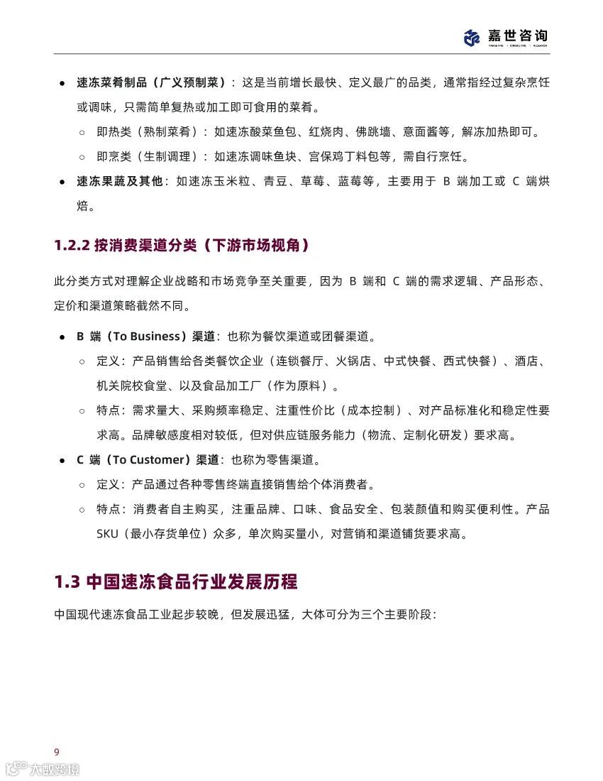 - 核心分类:速冻食品行业按原材料与工艺分类,包括速冻米面制品、速冻火锅料制品、速冻肉制品与调理制品、速冻菜肴制品等。按消费渠道分类,分为B端(餐饮渠道)和C端(零售渠道),两者的需求逻辑、产品形态、定价和渠道策略截然不同。