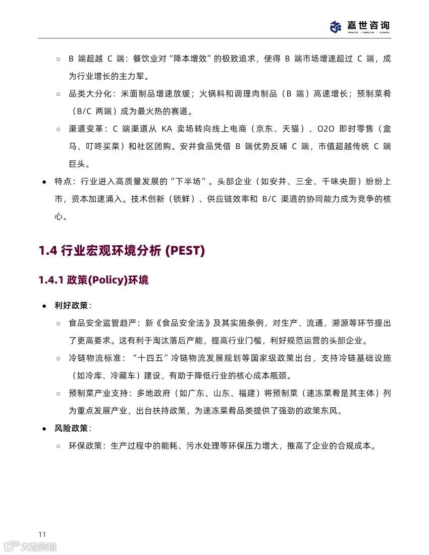 - 机遇:预制菜的蓝海市场爆发、B端餐饮连锁化率提升带来的标准化需求、C端消费升级(高端化、健康化、功能化)、渠道下沉与新零售的渗透等为行业带来新的发展机遇。