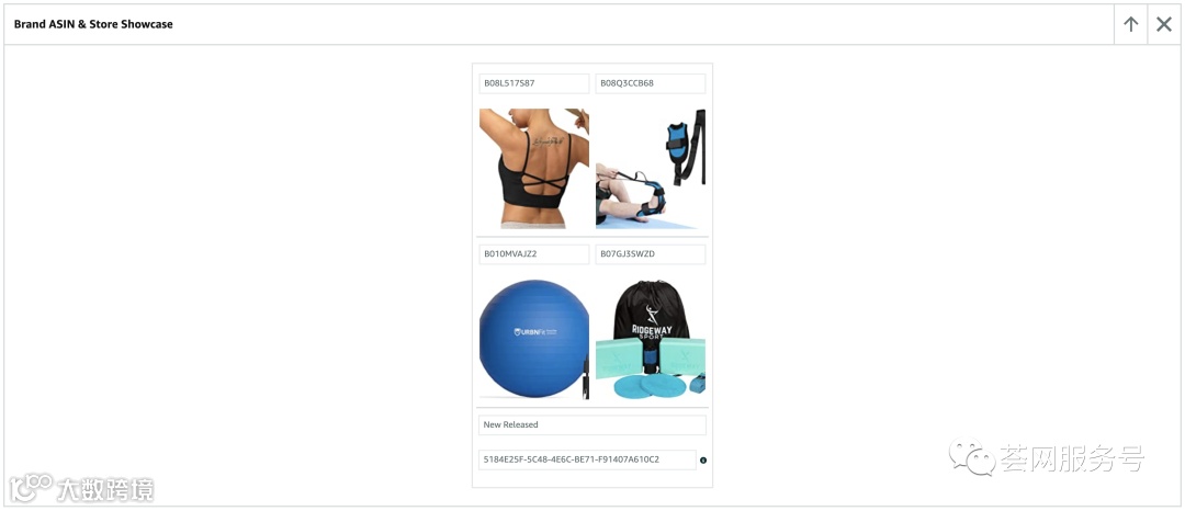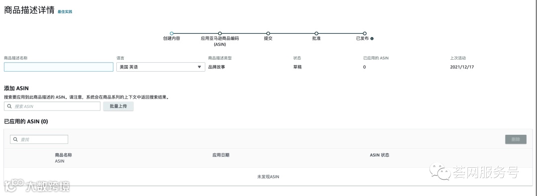 完成后点击“下一步”进入到“应用亚马逊商品编码(ASIN)”,建议大家在这个页面中尽可能放上自己品牌店铺中的所有ASIN,这可以让以上的品牌故事和4个新品展示在每一个自己的商品详情页A+页面顶部。