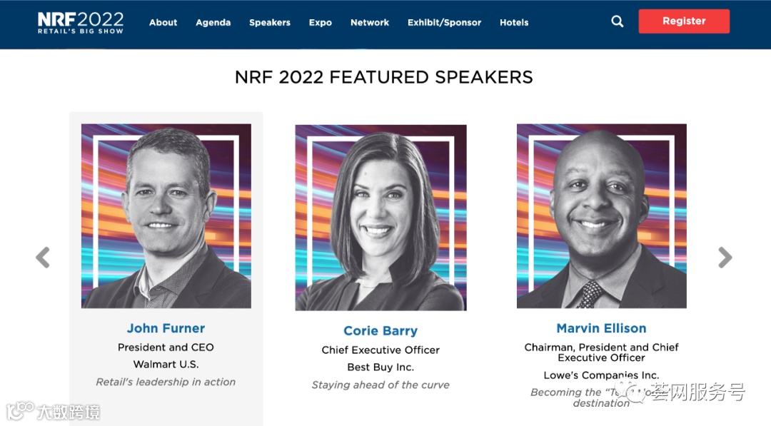 再过3周,也就是1月16-18日,荟网将在纽约参加全美零售业联合会(NRF, National Retail Federation)的年度峰会:NRF 2022 Retail Big Show,这次大会是全美零售行业的最大规模的行业论坛和展会,也是全球历史最悠久的零售业展会,已经有100多年历史。这次展会几乎所有零售商CEO都会参加,其中包括了大家熟悉的Walmart、BestBuy、HomeDepot、Macy's、Lowes、Costco等行业巨头,也包括Chewy、Zulily、CVS等中国卖家还不熟悉的垂直电商平台,同时还有Facebook(Meta)、Google (Alpha)、Pinterest、TikTok等科技界领军平台。