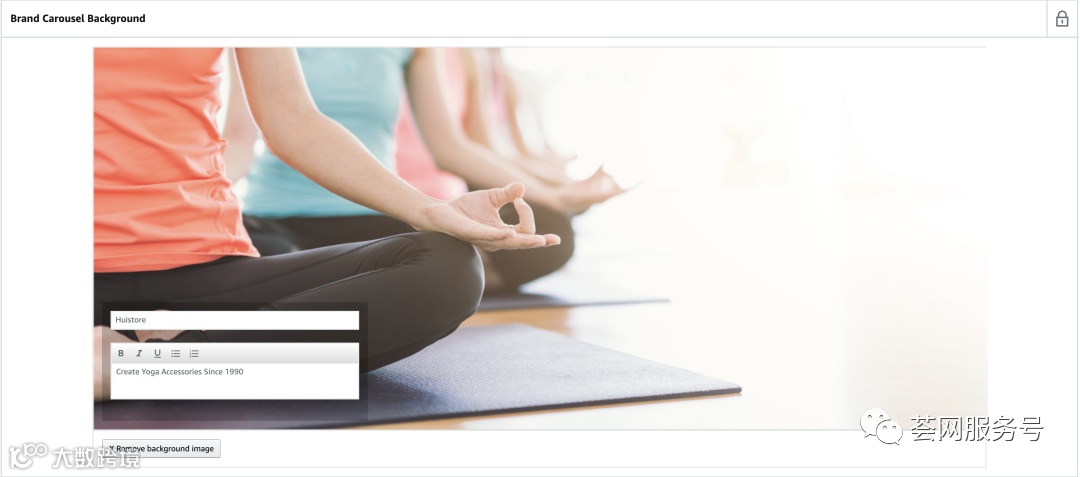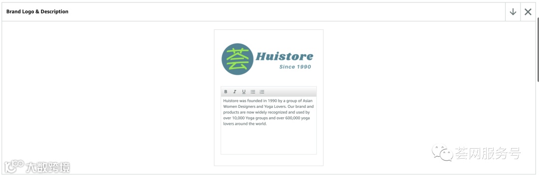 第三步:添加品牌名称和品牌宣传语,这里建议大家在品牌宣传语中加上“较早的年限”,让客户觉得你在该行业已经很久,更显专业。比如:Huistore,Create Yoga Accessories Since 1990