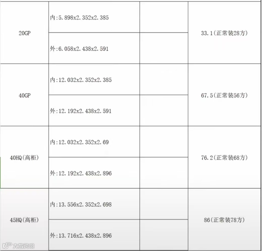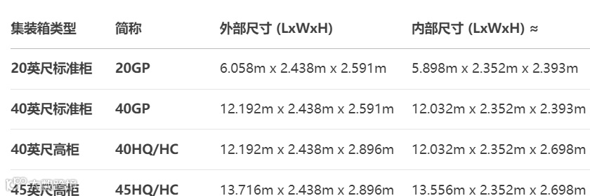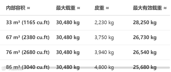 3.容积 (Cube): 集装箱内部的理论最大空间体积。实际可用体积会小于此值