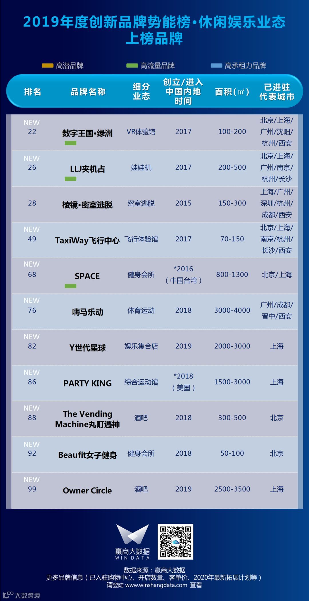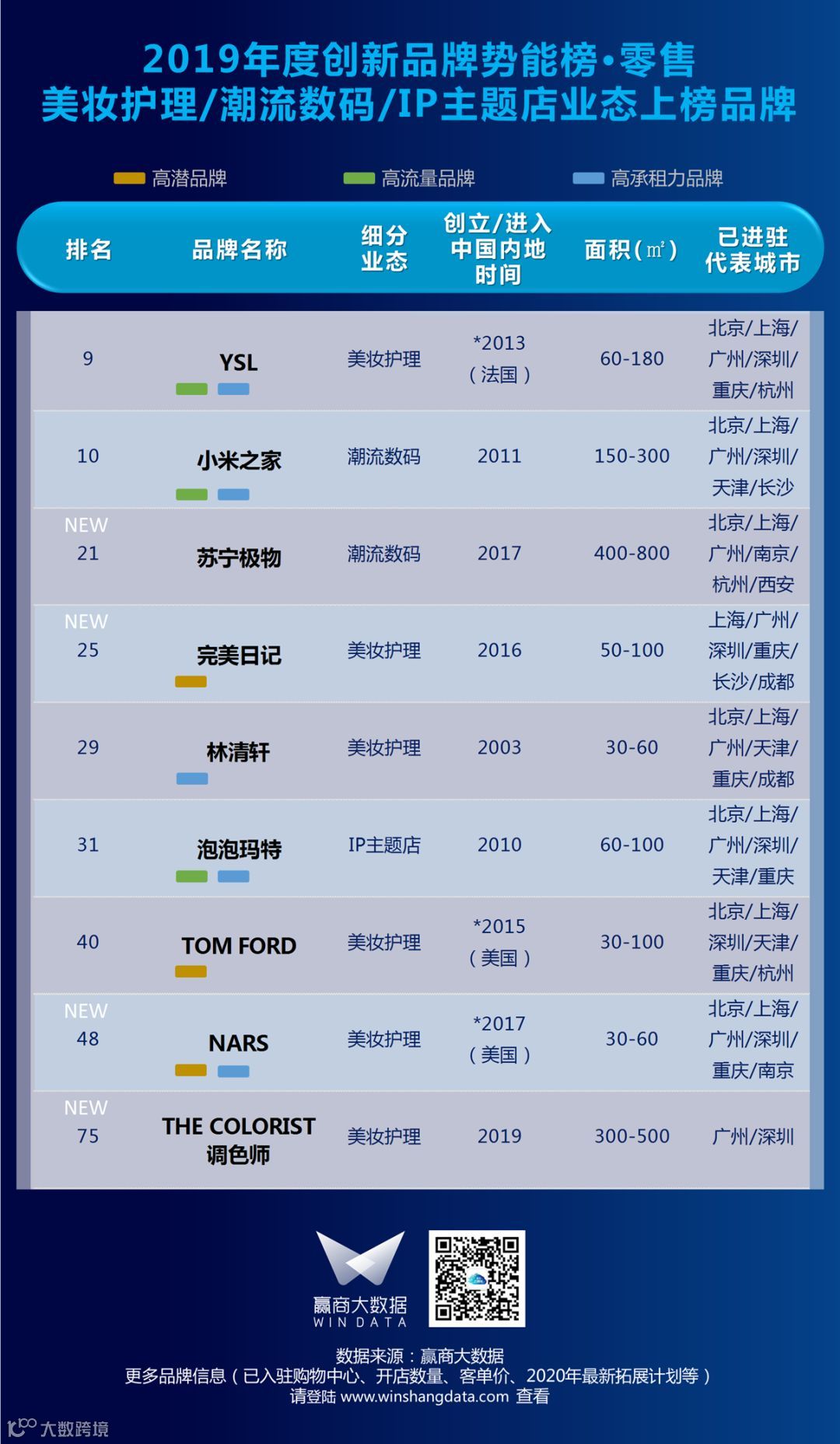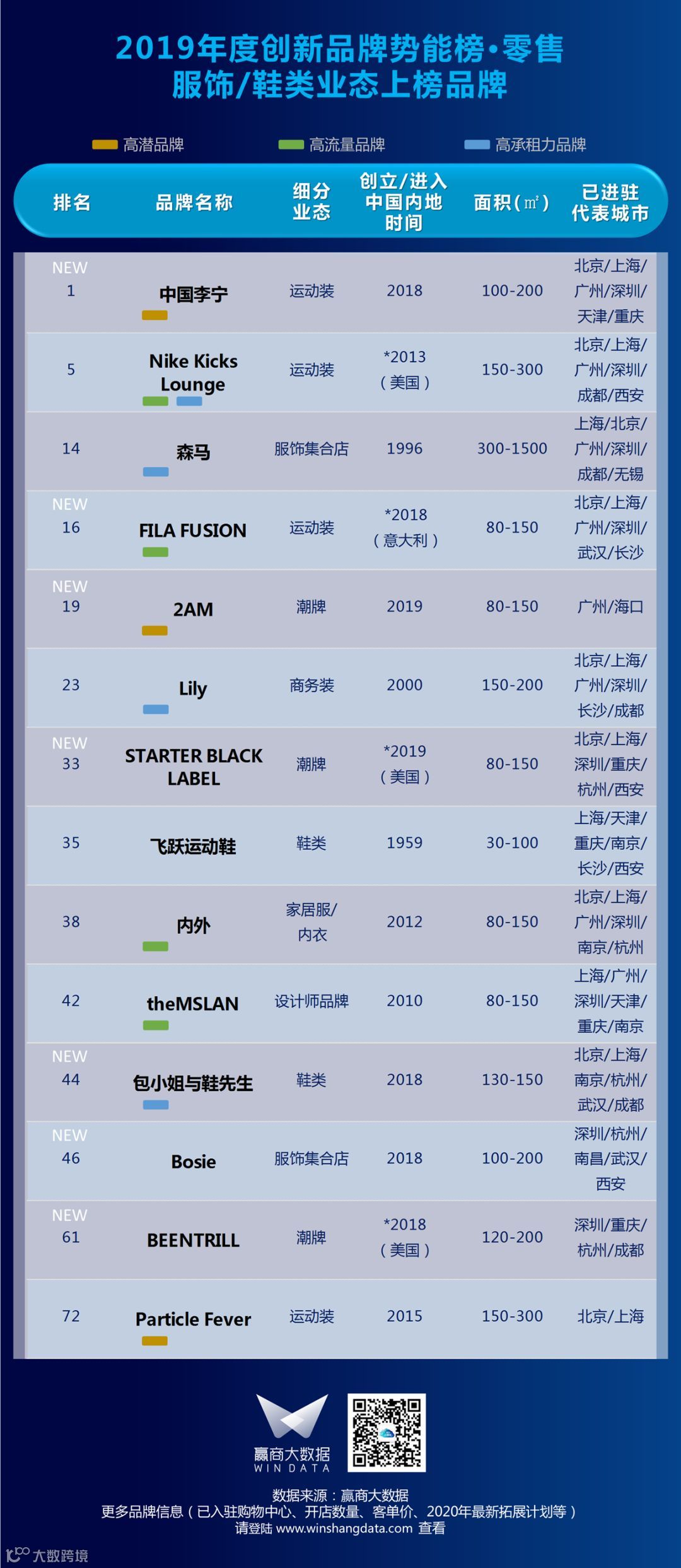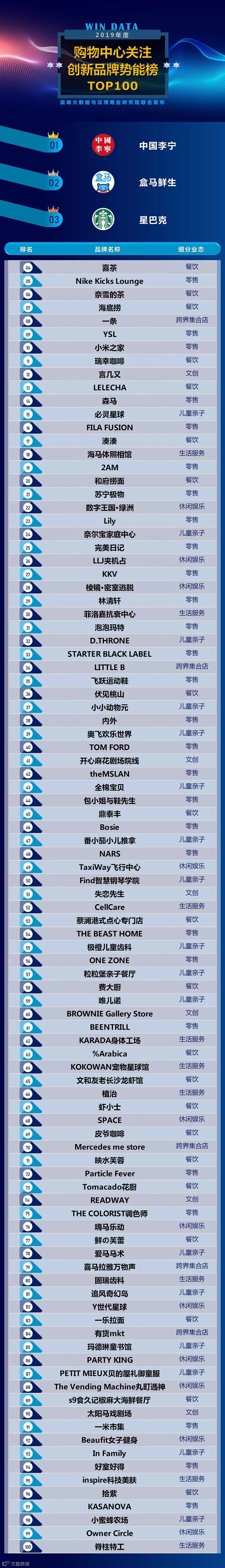 ▍汉博商业旗下智库汉博商业研究院联合赢商大数据,日前权威发布2019年度购物中心关注创新品牌势能榜TOP100。榜单显示,个性化需求喷发,渠道、品类、内容持续分化,“国潮”进入崭新的3.0时代,中国元素成功接轨国际,新品牌、新产品层出。更多详情,请见如下榜单:▎