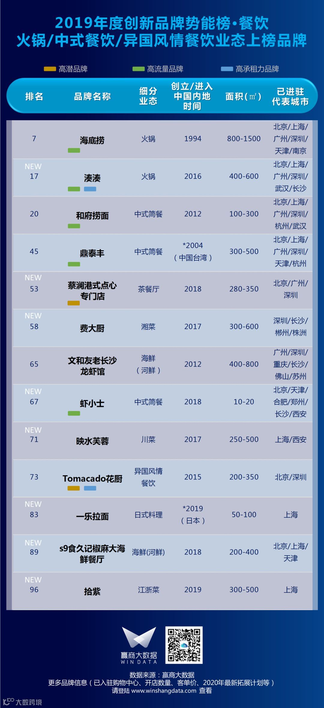 测评方法:结合赢商大数据独家品牌评价体系、品牌进驻城市等级、购物中心等级、品牌创新实力、品牌门店增速、拓展城市等级、拓展规模、赢商大数据浏览热度、社交媒体活跃度、网络热词搜索指数、品牌所属业态创新热度、业态发展增速等多个维度进行综合测评。品牌排名越靠前,品牌综合发展势能越强