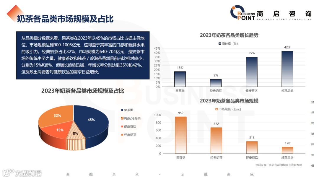 从品类细分数据来看,果茶类在2023年以45%的市场占比占据主导地位,市场规模达到900-1005亿元,这得益于其丰富的口感和新鲜水果的吸引力。经典奶茶占比32%,市场规模为640-704亿元,是奶茶市场的传统中坚力量。健康茶饮和纯茶 / 冷泡茶虽然目前占比相对较小,分别为15%和8%,但增长趋势迅猛,年增长率分别达到35%和42%。这反映出消费者对健康饮品的需求日益增长。