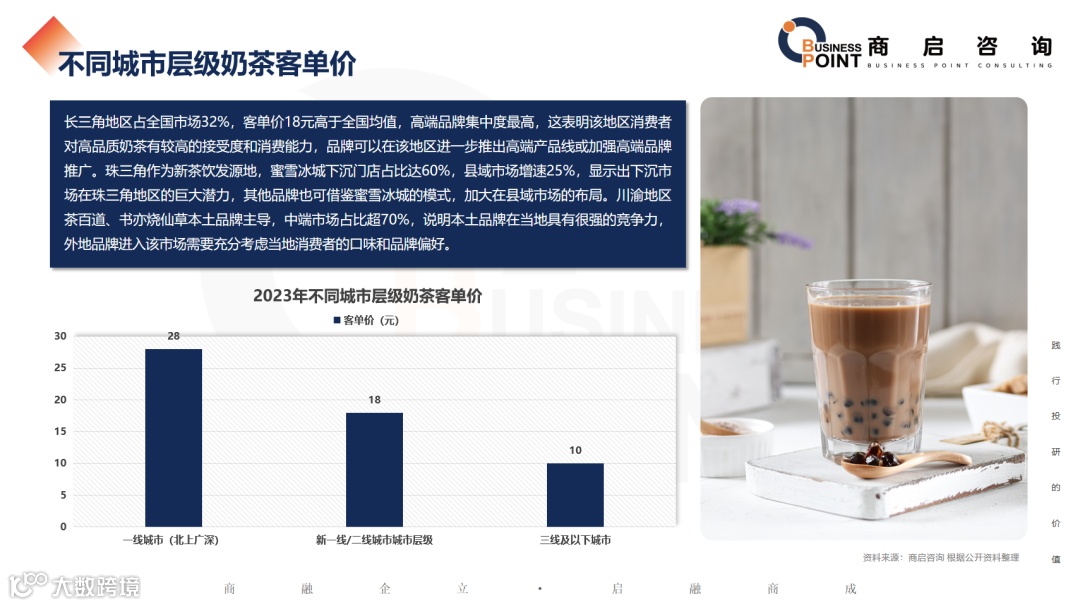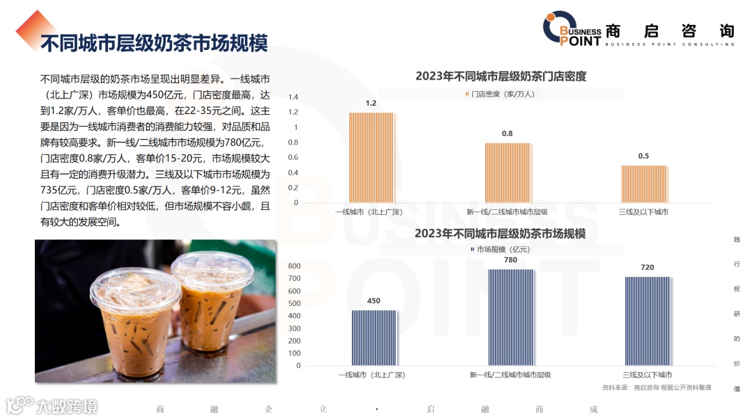 不同城市层级的奶茶市场呈现出明显差异。一线城市(北上广深)市场规模为450亿元,门店密度最高,达到1.2家/万人,客单价也最高,在22-35元之间。这主要是因为一线城市消费者的消费能力较强,对品质和品牌有较高要求。新一线/二线城市市场规模为780亿元,门店密度0.8家/万人,客单价15-20元,市场规模较大且有一定的消费升级潜力。三线及以下城市市场规模为735亿元,门店密度0.5家/万人,客单价9-12元,虽然门店密度和客单价相对较低,但市场规模不容小觑,且有较大的发展空间。