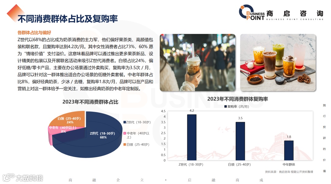 Z世代以68%的占比成为奶茶消费的主力军,他们偏好果茶类、高颜值包装和联名款,且复购率达到4.2次/月。其中女性消费者占比73%,60% 愿为“情绪价值”支付溢价。这意味着品牌可以通过推出更多果茶新品、设计精美的包装以及开展联名活动来吸引Z世代消费者。白领占比24%,偏好低糖/零卡产品,主要在办公场景通过外卖购买,复购率为3.5次 / 月,品牌可以针对这一群体推出适合办公场景的低糖外卖套餐。中老年群体占比8%,偏好经典奶茶,少冰 / 去糖,复购率1.8次/月,品牌可以在产品和营销上对这一群体给予一定关注,如推出经典奶茶的中老年定制版。