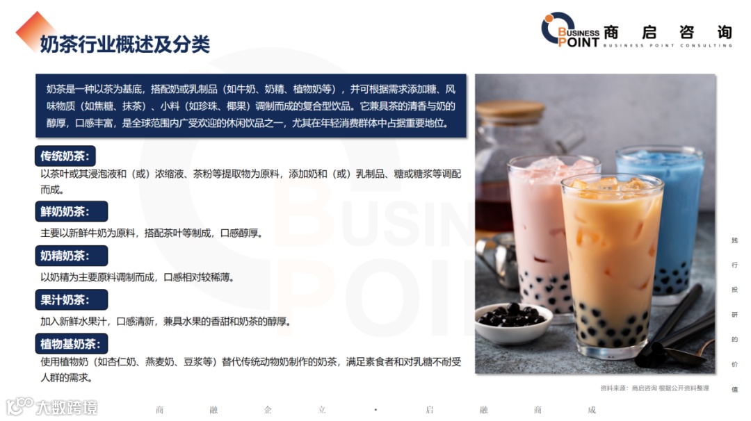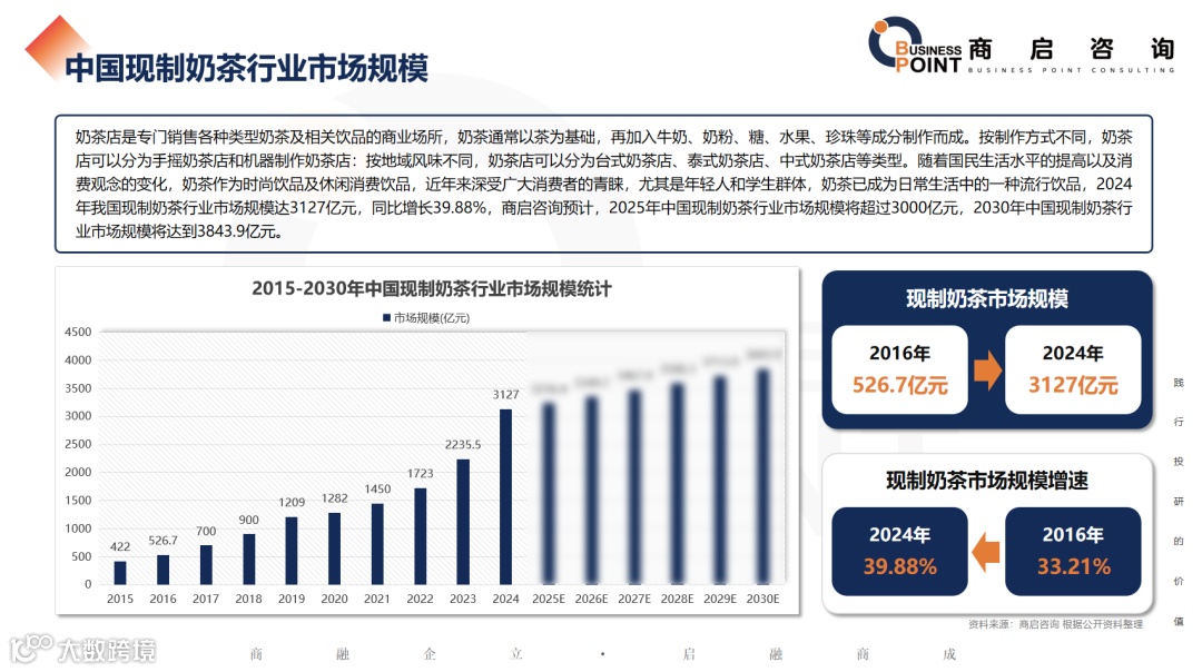 奶茶店是专门销售各种类型奶茶及相关饮品的商业场所,奶茶通常以茶为基础,再加入牛奶、奶粉、糖、水果、珍珠等成分制作而成。按制作方式不同,奶茶店可以分为手摇奶茶店和机器制作奶茶店:按地域风味不同,奶茶店可以分为台式奶茶店、泰式奶茶店、中式奶茶店等类型。随着国民生活水平的提高以及消费观念的变化,奶茶作为时尚饮品及休闲消费饮品,近年来深受广大消费者的青睐,尤其是年轻人和学生群体,奶茶已成为日常生活中的一种流行饮品,2024年我国现制奶茶行业市场规模达3127亿元,同比增长39.88%,商启咨询预计,2025年中国现制奶茶行业市场规模将超过3000亿元,2030年中国现制奶茶行业市场规模将达到3843.9亿元。