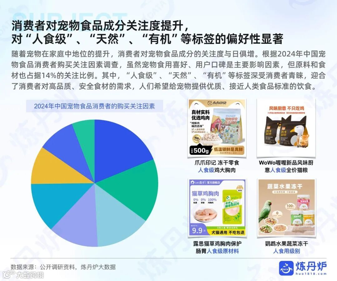 随着宠物在家庭中地位的提升,消费者对宠物食品成分的关注度与日俱增。根据 2024 年中国宠物食品消费者购买关注因素调查,虽然宠物食用喜好、用户口碑是主要影响因素,但原料和食材也占据 14% 的关注比例。其中,“人食级”“天然”“有机” 等标签深受消费者喜爱,这迎合了消费者对高品质、安全食材的需求,人们希望给宠物提供优质、接近人类食品标准的饮食。
