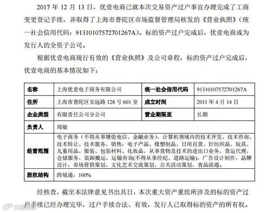 此次交易历经关键节点:2016年12月1日,优壹电商股东会通过股权转让决议;2017年12月1日,跨境通获中国证监会核准批复[k]。随后,双方于2017年12月13日完成工商变更登记,优壹电商正式成为跨境通全资子公司[k]。目前,跨境通注册资本为1,508,378,632.00元[k]。