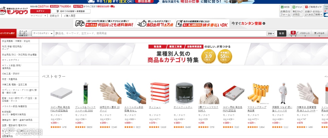 简介: 日本最大的MRO(维护、修理和运营)工业品B2B平台之一。专注于切削工具、磨料、设备和工具等行业用品。许多日本制造商和建筑商通过该平台采购。如果你的产品是工业品,这是必查的网站。