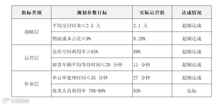 关键指标:总物流成本降至营收8.5%,全国平均交付时效2.3天,各仓交付及时率均≥92%。