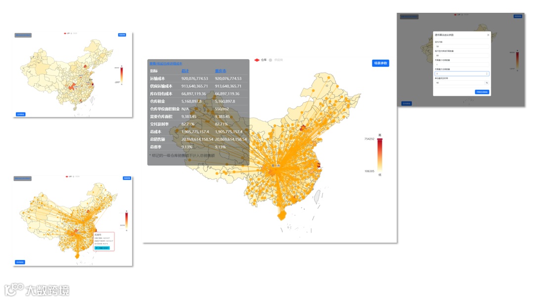 依据“物流战略层级决策”模块,以“成本-时效平衡”为核心,通过智能算法选址与多方案对比,确定全国仓网布局。