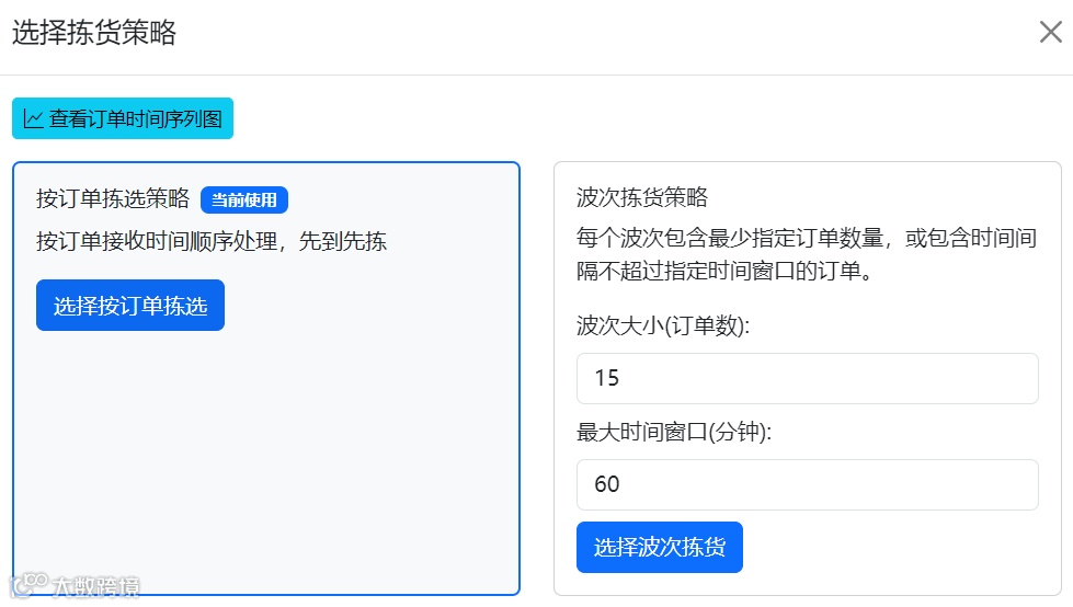 对比软件“按单拣选”与“波次拣选”两种策略:
