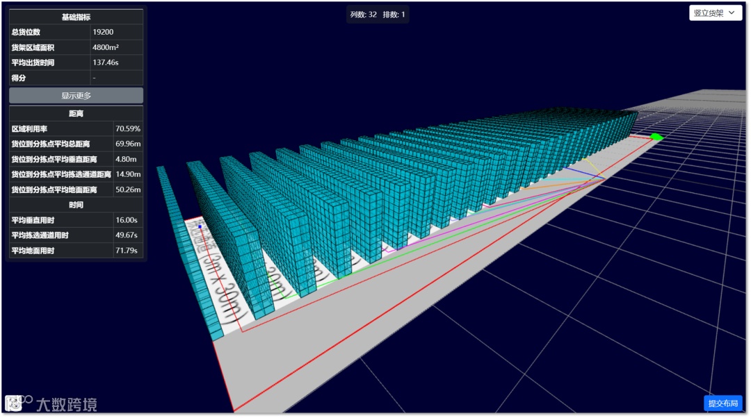 货架参数:设置货架排数2排、列数24列、层数5层,总货位数8640个,区域利用率63.53%,货位到分拣点平均总距离87.27m(软件仿真指标);