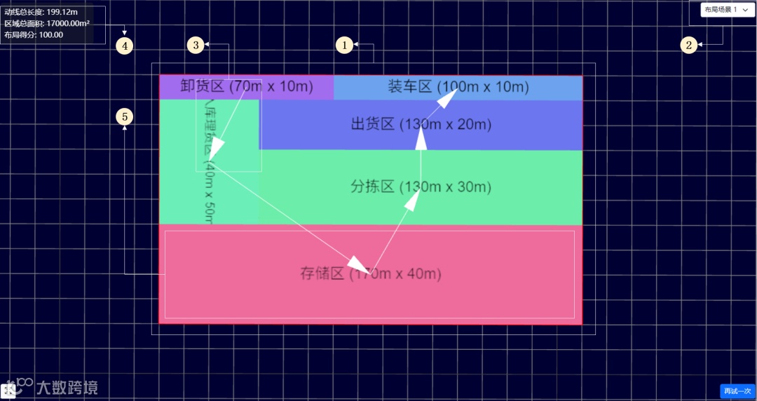 动线优化:采用“单向循环动线”,物料从卸货区进入后,沿理货区→存储区→分拣区→出货区→装车区流转,动线总长度从初始280m缩短至199.12m,区域总面积17000m²;
