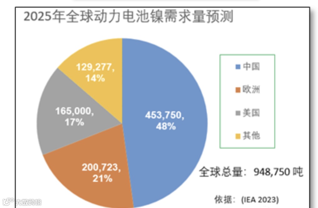 根据国际能源机构(IEA 2023)报告,2022年,全球汽车锂电池能量需求为550Gwh,折合镍金属量估算需要255,200吨。2025年,预测全球EV销量2300万辆(IEA,2023), 对应估算镍金属量948,750吨。2030年,全球EV预测销量4500万辆(IEA,2023), 对应估算镍金属量1,856,250吨。