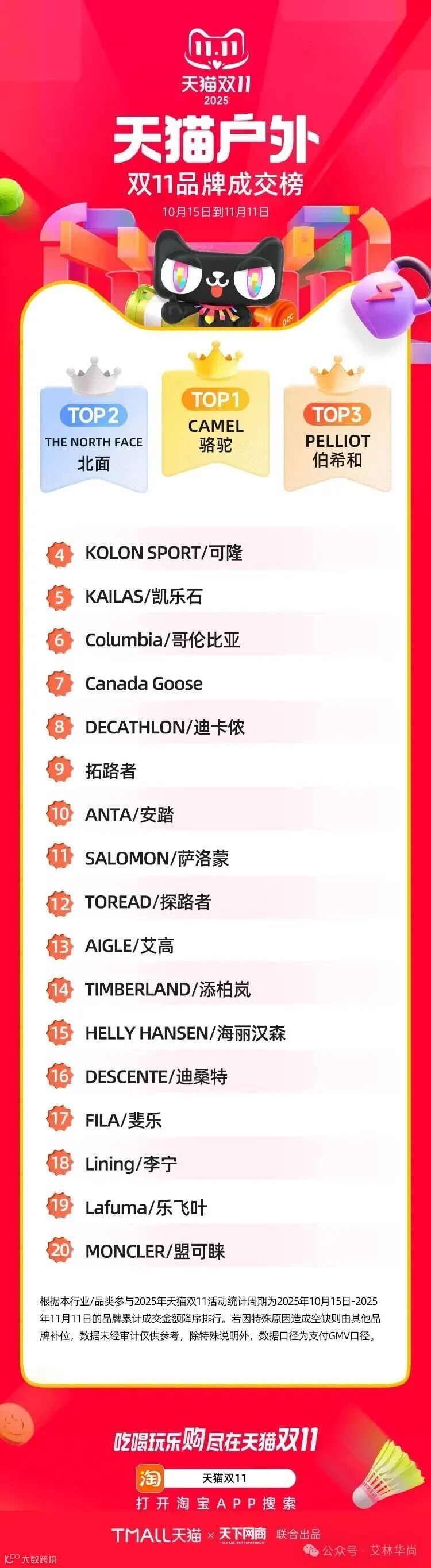 运动户外天猫“双11”品牌成交榜上,斐乐、阿迪达斯、耐克拿下前三,lululemon跃升为第4名,迪桑特升至第8名;其中,细分榜户外品牌榜中,骆驼、北面、伯希和稳居前三,拓路者(服饰)、安踏跻身前十。