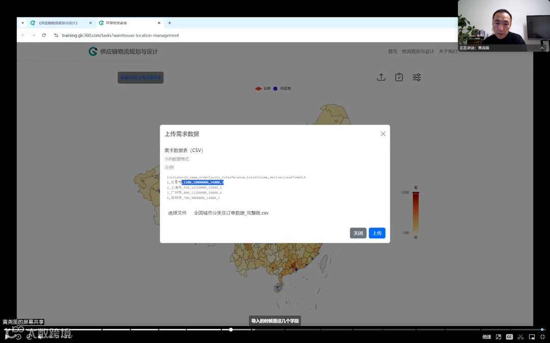 这个工程的成本相对较高,但可以作为颗粒度的模拟来代表实际情况。目前存在的问题是没有考虑库存持有天数,只考虑了订单总销售额和商品毛利。另外,地图上的辐射线条是通过点击城市来显示或隐藏的。仓库面积的决策是根据仓库面积、库存持有天数和每天作业量来计算的。最近增加了导入功能,可以导入城市数据,如订单数量、总体积、订单金额和承诺交付周期等。导入的数据可以在地图上显示为热力图。后续可能会增加配送模型,如城市到门店的数据。