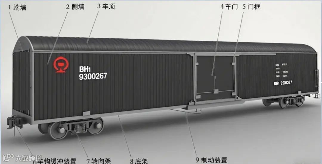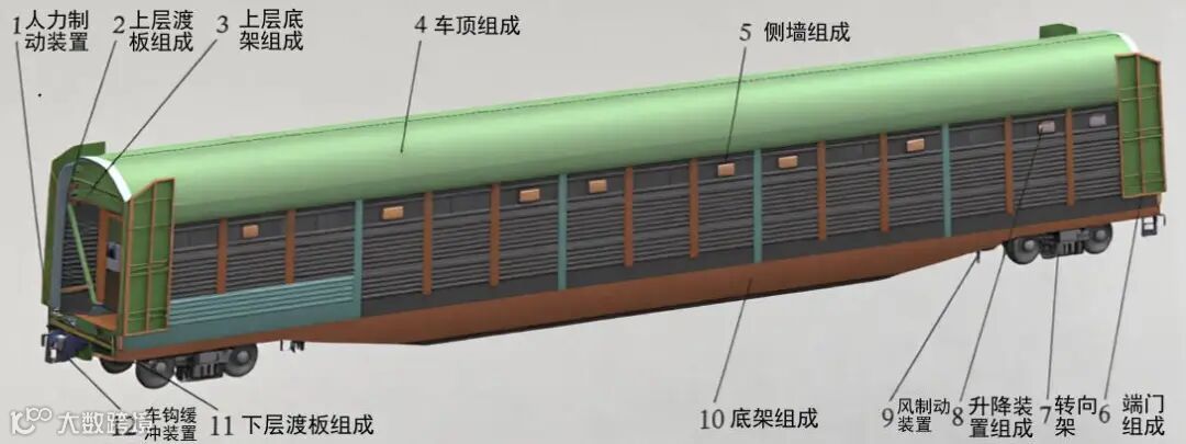 小汽车运输专用车是一种具有端门、侧墙和车顶等结构的封闭式车辆,主要用于运输小型汽车、轻型客车等,主要由车体、转向架、制动装置和车钩缓冲装置等组成。