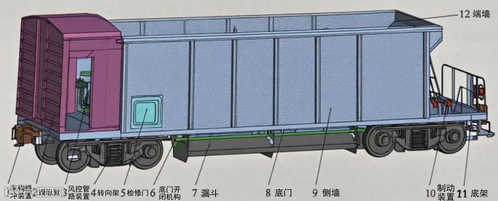 KM70A型煤炭漏斗车采用全钢焊接结构,由底架、侧墙、端墙、底门等部件组成。全车共设有14个底门,主要由门板、折页、锁钩、扇形板及扭杆弹簧等组成,无风动开闭装置。