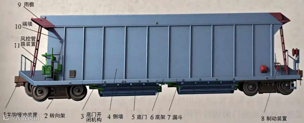 石砟漏斗车是一种专用的无盖漏斗车,主要供铁路线路新建、维修时铺设石砟或工矿企业装运散粒货物之用,具有边走边卸和向轨道内、外侧卸砟的功能。