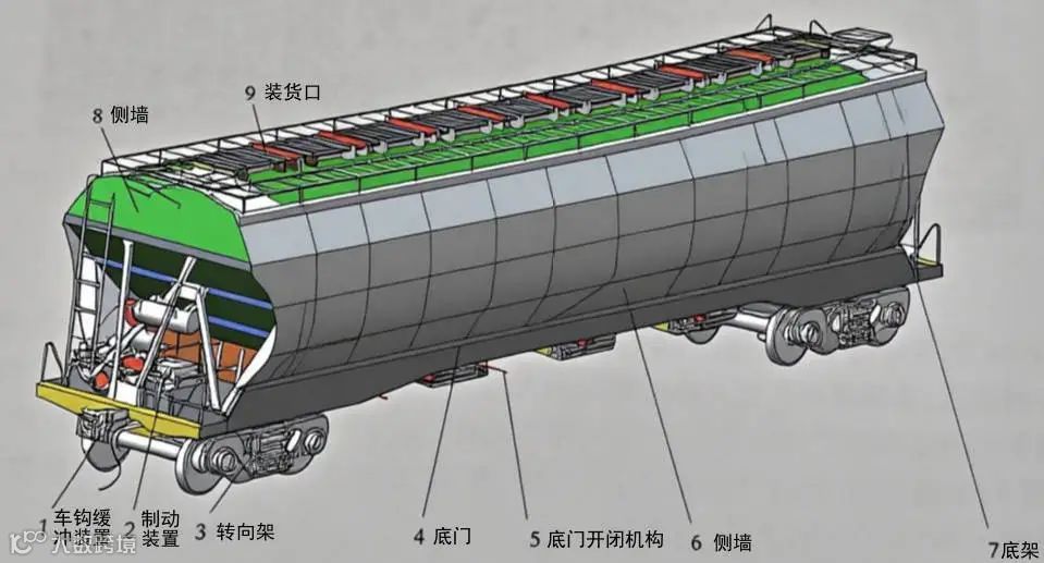 铁路货车主要由车体、转向架、制动装置和车钩缓冲装置等组成。
