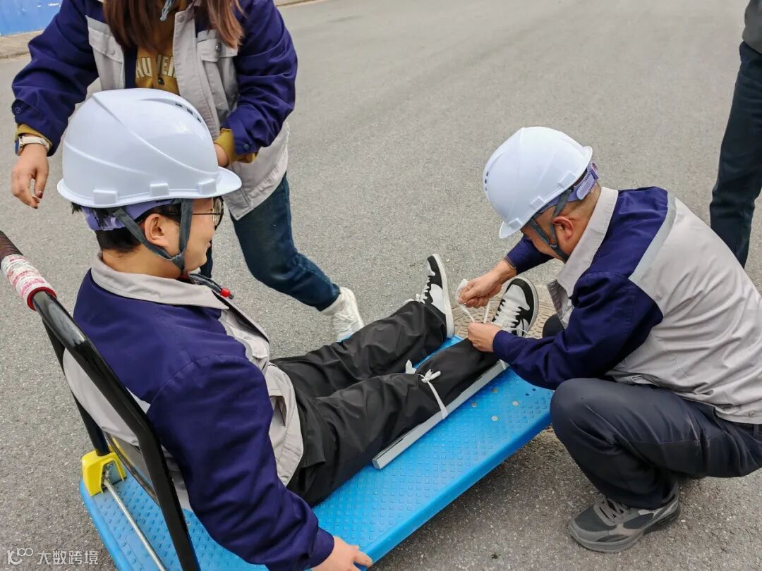 三人小组需以“三人四足”的方式协同前进,考验着彼此的默契与信任。抵达“伤员”所在地后,队员们迅速分工,熟练地进行伤口包扎,并合力采用担架平稳、快速地将“伤员”转移至安全区域。整个流程紧张有序,将团队协作、互救互助的精神体现得淋漓尽致。