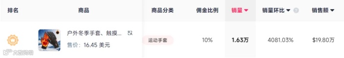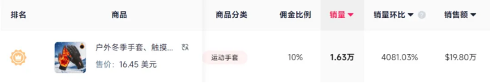 近日,一款女式纯色保暖长袜的周销量达到了2.64万件,登顶类目榜一。此外,其他品类的“暖”产品,近期也有销量上涨趋势,跨境卖家可以关注。如一款户外冬季保暖手套,7日销量超1.63万件,周期内销量环比超4081.03%,成为运动与户外类目销量榜第一。此外,在居家日用类目中,一款摇粒绒材质、帽子与口罩2合1的防风保暖面罩,周销量也突破1.11万单,展现出不俗的爆单势头。