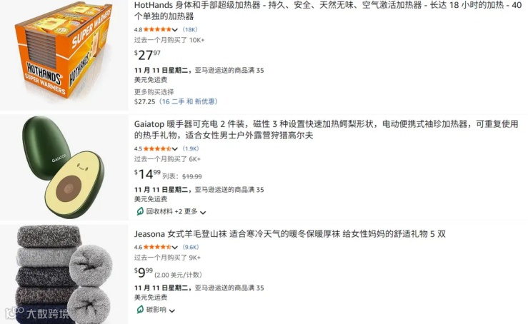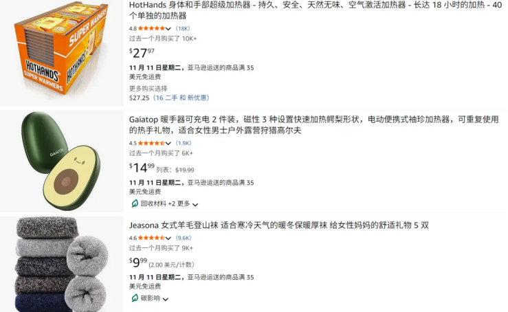 而在亚马逊美国站,保暖、防风、抗寒也成了应季主题,从暖手宝、加热垫到保暖裤、羊绒袜,再到真皮手套,防风面罩都出现销量持续走高趋势,相关领域的跨境卖家可以根据市场需求情况布局营销。