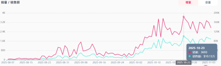 根据后台数据,该款紧身裤在今年8月份开始出现销量上升趋势,9月份其销量逐渐攀升达到2万多件,而到了10月份,其月销量已飙升到7万多件,并拿下了当月女装类目销冠。