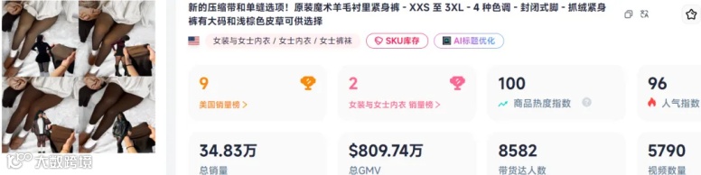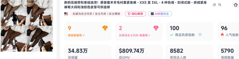 截至目前,SWEET MAYHEM店铺的这款抓绒紧身裤共售出了34.83万单,总GMV约809.74万美元(约合人民币5772万元)。看似普普通通的保暖打底裤,却能在竞争激烈的TikTok美区女装赛道销量长红,一路开挂,SWEET MAYHEM的这款抓绒打底裤到底做对了什么?
