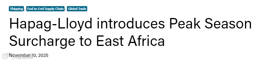 非洲、欧洲、中东、印度次大陆和巴基斯坦的货物,自2025年11月15日起开始加收费用,20英尺集装箱收600美元,40英尺集装箱收950美元,干货、特种货物和冷藏货物均适用该标准;